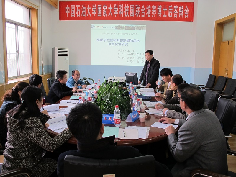 首先是仝坤博士进行了出站答辩,其研究课题为“活性焦吸附提高稠油废水可生化性研究”,该研究是利用和褐煤活性焦作为吸附剂,吸附废水中的有机毒性污染物,以提高后期废水的可生化性能,经过现场答辩,专家委员会认为,该研究成果与其他工艺相比,具有成本低,出水水质好,可调节性强的特点,同时,吸附饱和的活性焦可以作为燃料燃烧,既解决了固体废弃物处理问题,又实现了废物资源化利用,具有较高的学术意义和很强的工程指导价值。